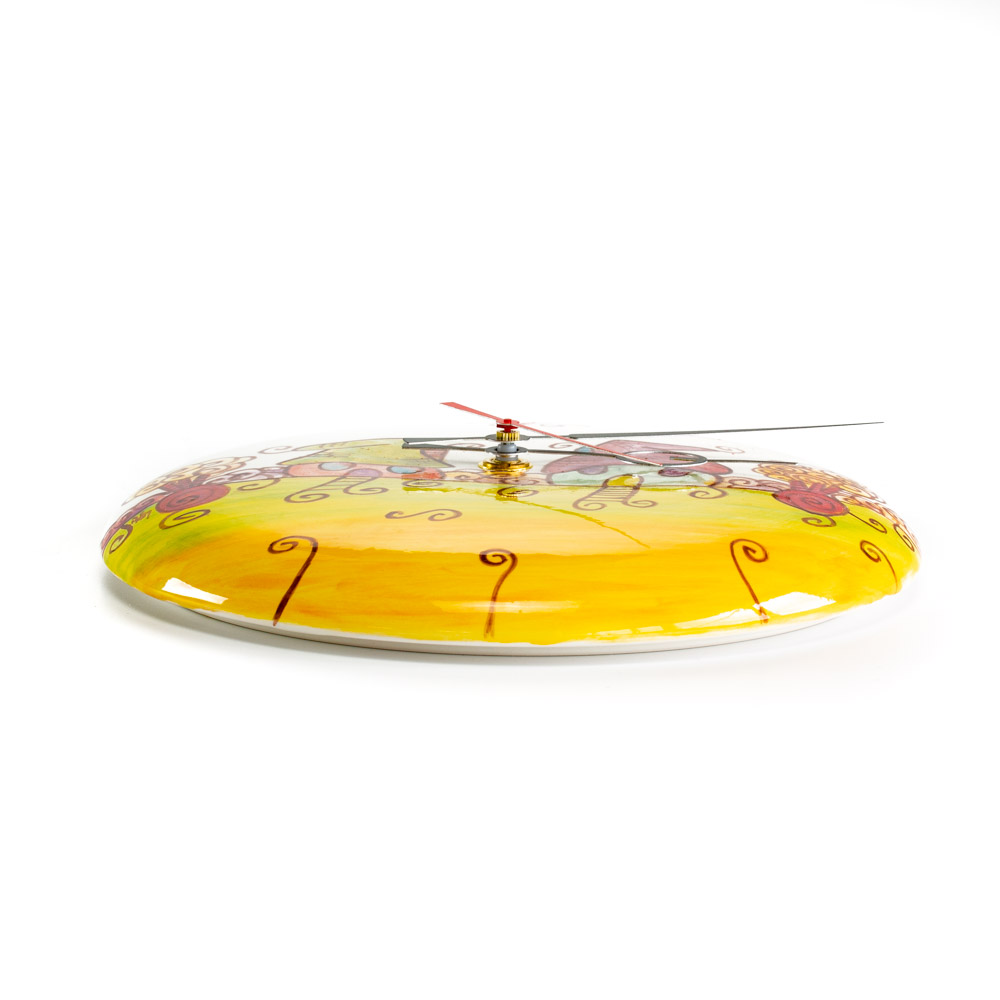Orologio Naif diametro 21 cm decorato a mano con disegno gioioso con casette, nuvole e sole. Batteria inclusa.