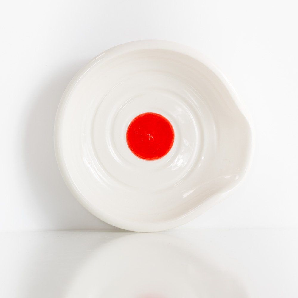 Poggiamestolo diametro 10 cm tondo in ceramica fatto al tornio con al centro un tocco di colore.
