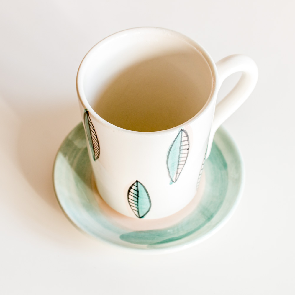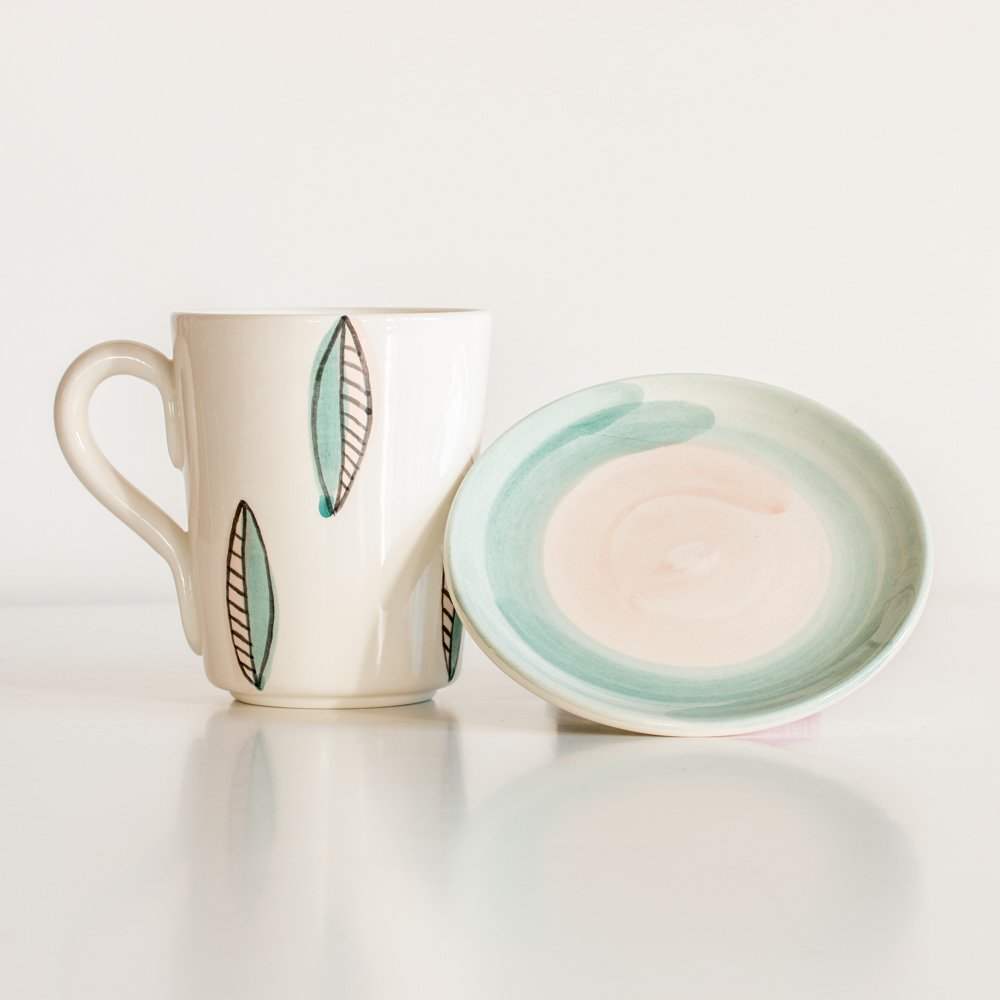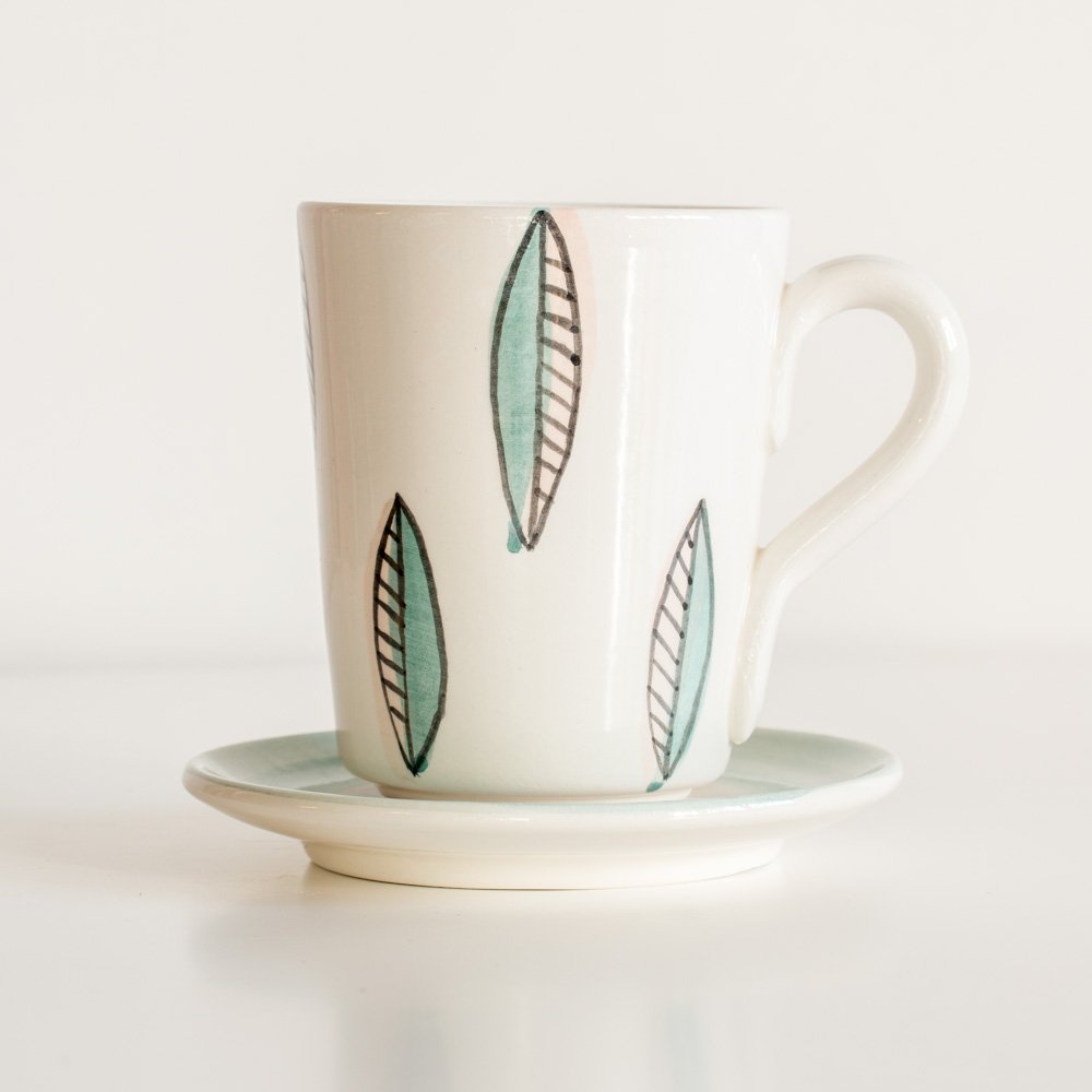 Tazza mug altezza 10 cm diametro 8 cm con piattino in ceramica decorata a mano. No lavaggio lavastoviglie.